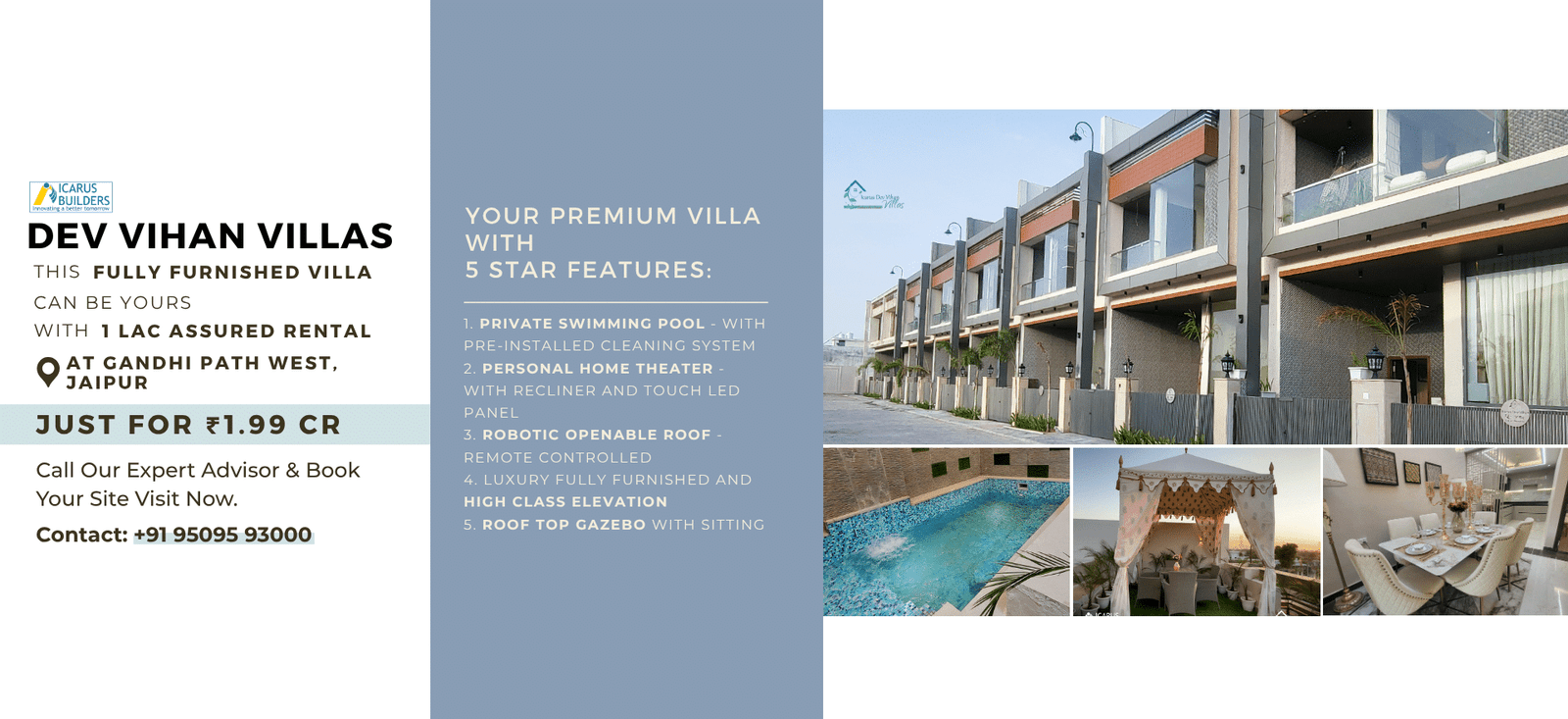 Icarus Dev Vihaan Villas is situated in Bhankrota, Jaipur, a city known for its rich cultural heritage and modern amenities.